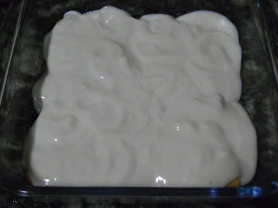 Faça uma camada do biscoito molhado com a calda do pêssego.