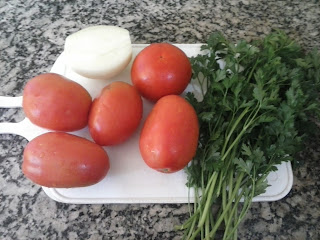 Pique a cebola e tomate em pedaços de 1cm aproximadamente.