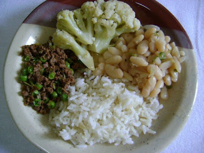 Arroz, feijão branco, proteína de soja com ervilhas e salada de couve-flor.
