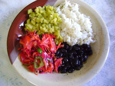 Arroz, feijão preto, abobrinha refogada e salada de tomate/beterraba/cenoura/pimentão.