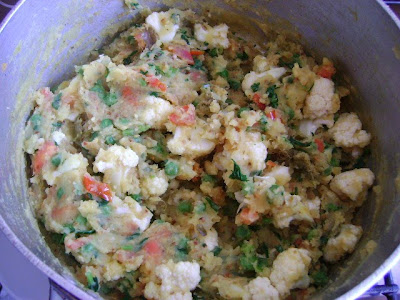 Refoga por uns três minutos e acrescente a batata, a ervilha e o sal. Refogue por mais uns três minutos e coloque o coentro e o couve-flor e desligue o fogo, pois o couve-flor fica cru, que na hora da fritura ele fica aldente e delicioso.