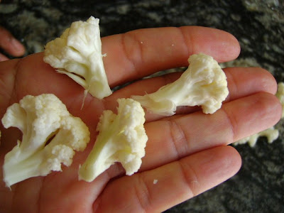 Corte os bouques do couve-flor bem pequeno e deixe de molho na água com limão ou vinagre.